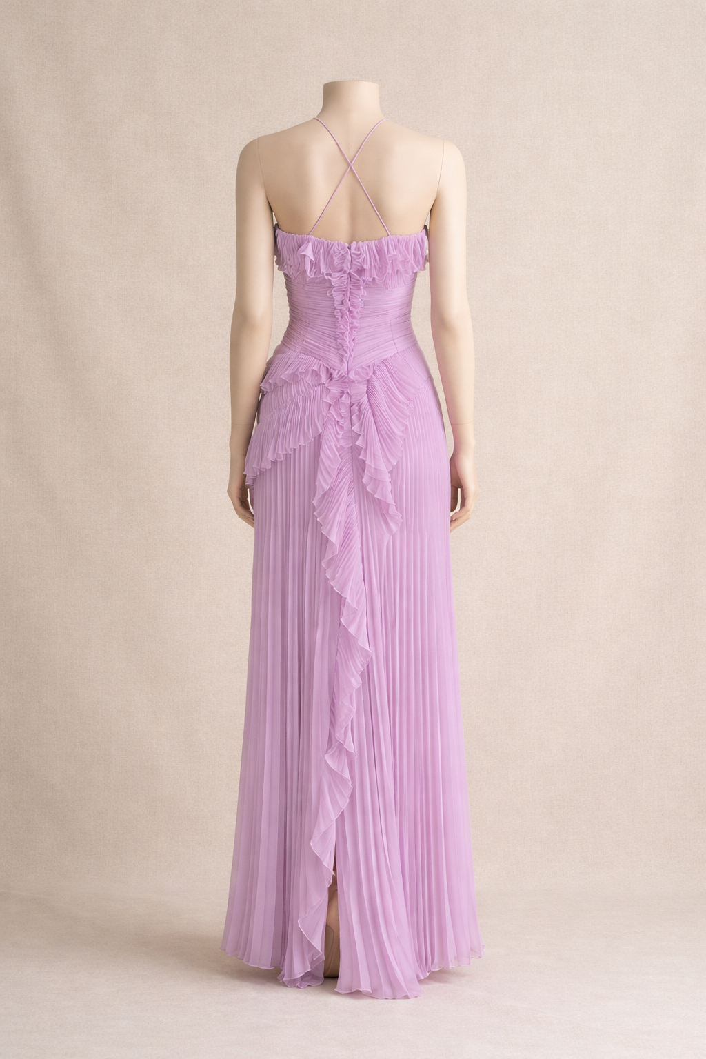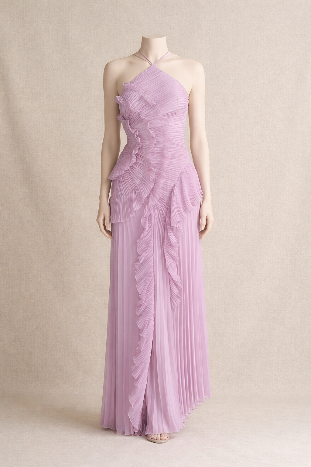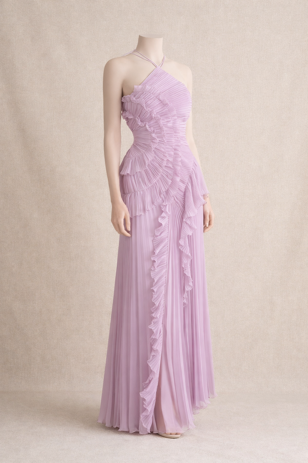 Robe longue lilas plissée à col licou et drapé asymétrique