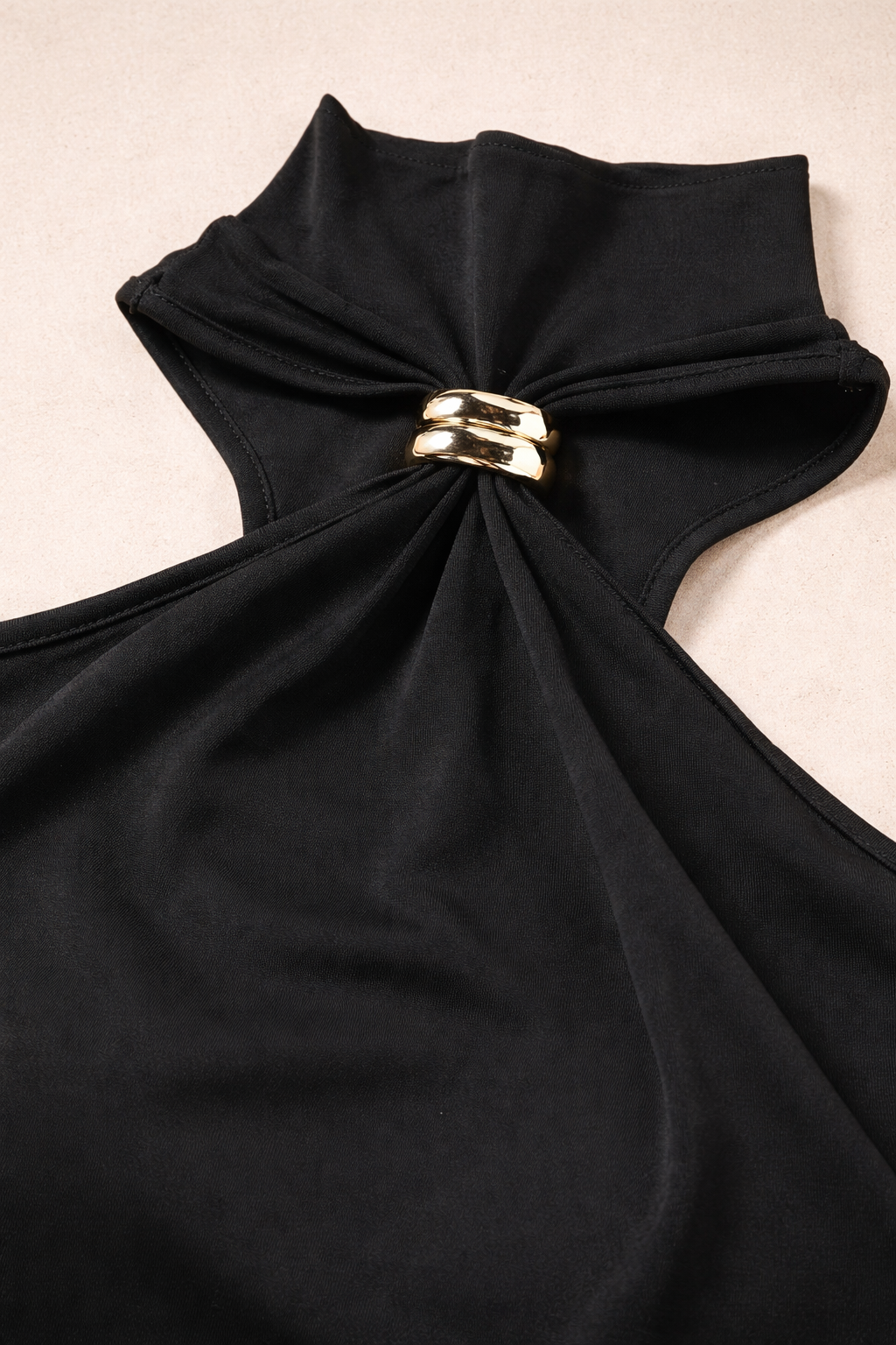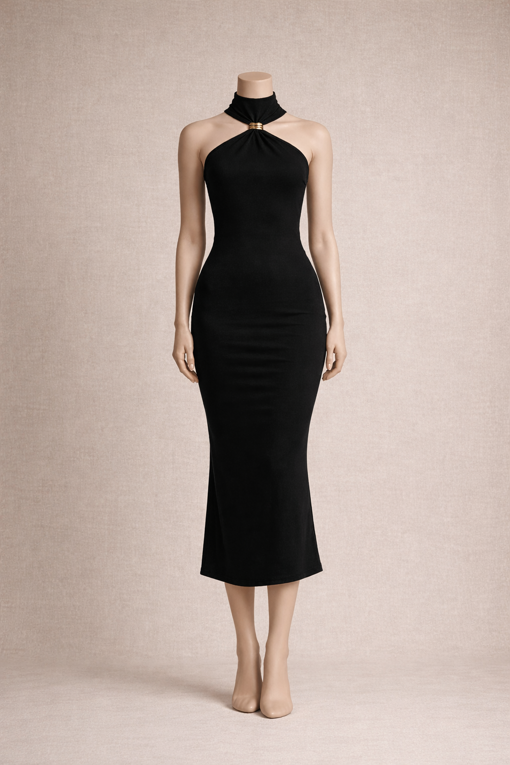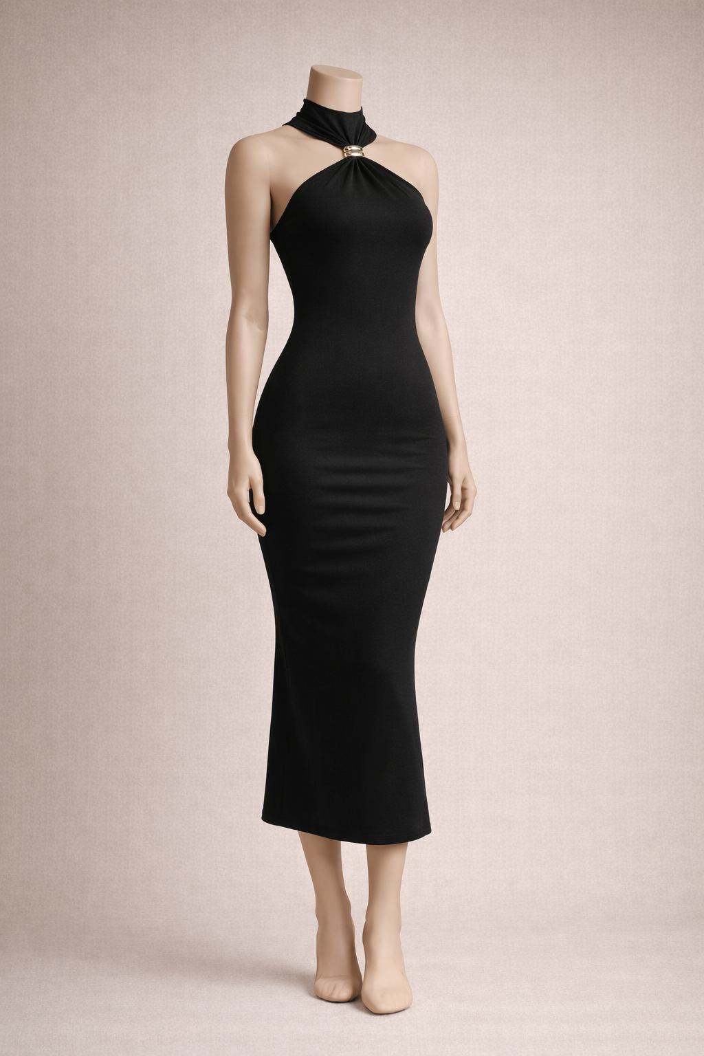 Son col semi-ouvert met en valeur le buste tandis que la coupe près du corps souligne naturellement la silhouette. Sans manches et longueur mi-mollet, elle offre une ligne raffinée idéale pour l’été.