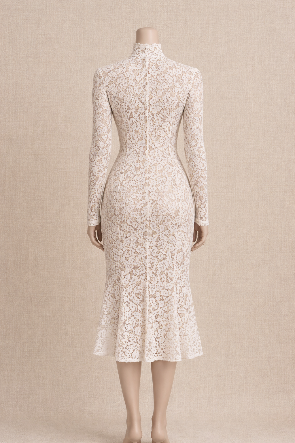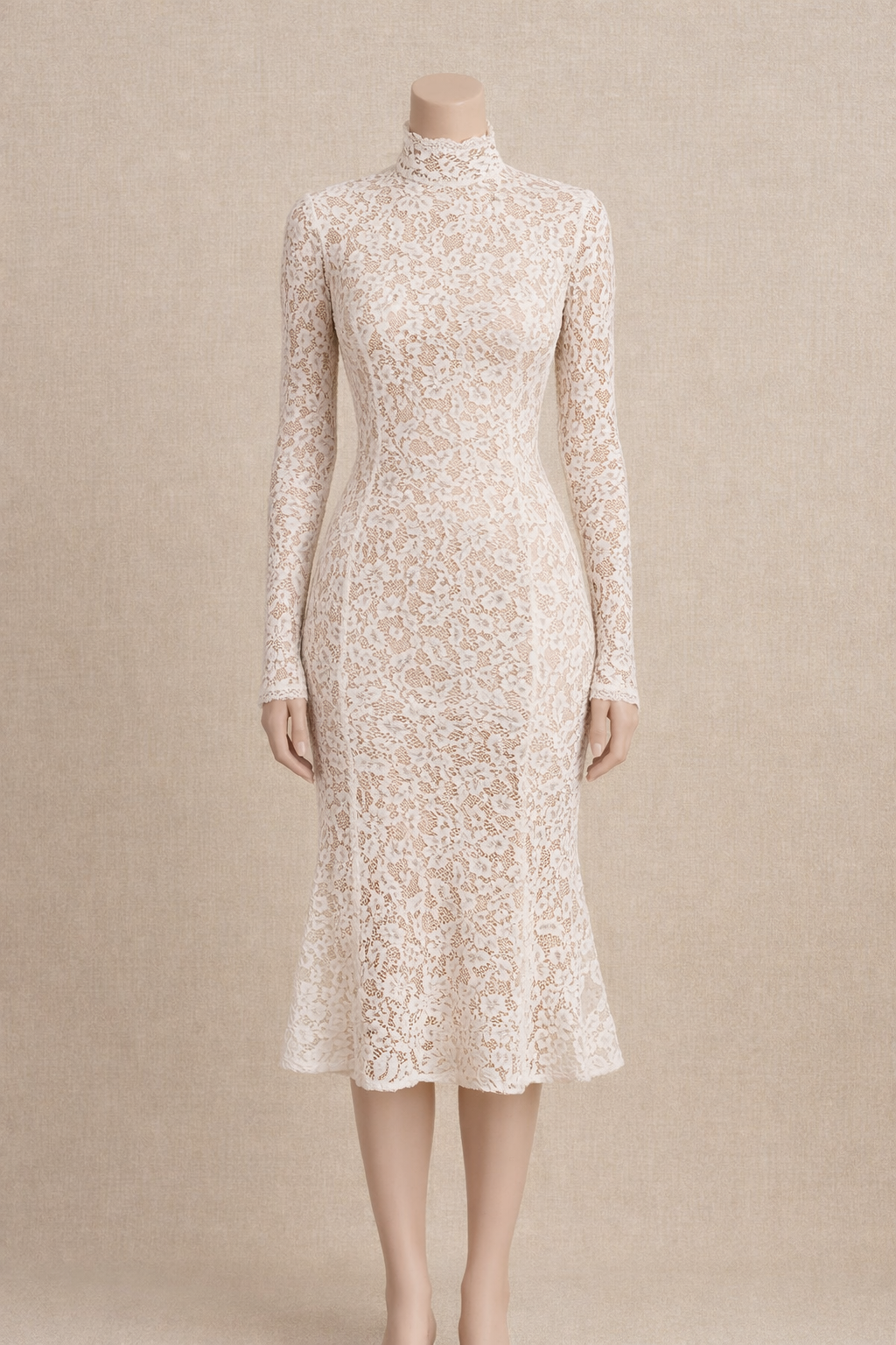 Son col légèrement montant structure le haut de la silhouette tandis que la coupe ajustée souligne naturellement la ligne. Les manches longues et la longueur mi-mollet apportent équilibre et sophistication pour la saison automne/hiver.