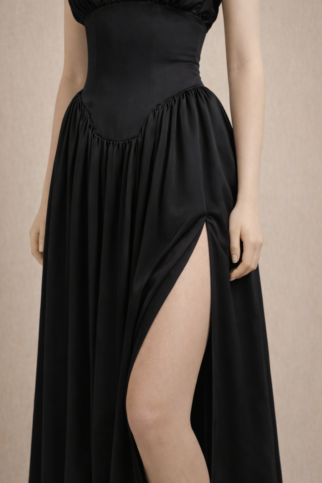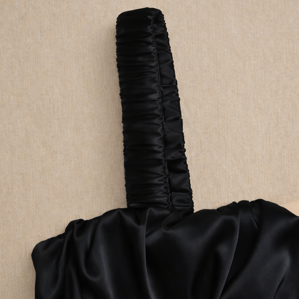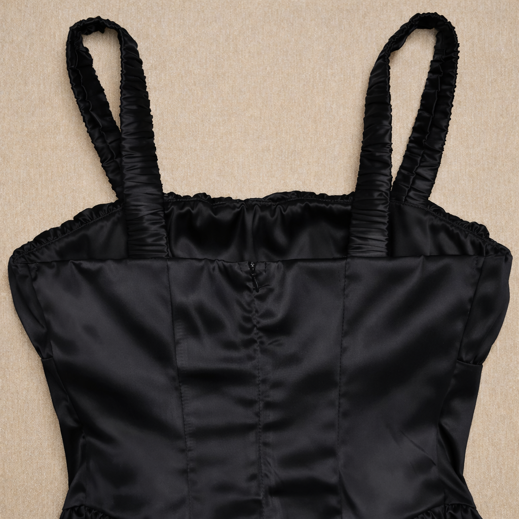 Son col carré et ses fines bretelles structurent le buste avec élégance, tandis que le dos nu apporte une touche sensuelle maîtrisée. La coupe slim souligne naturellement la silhouette.