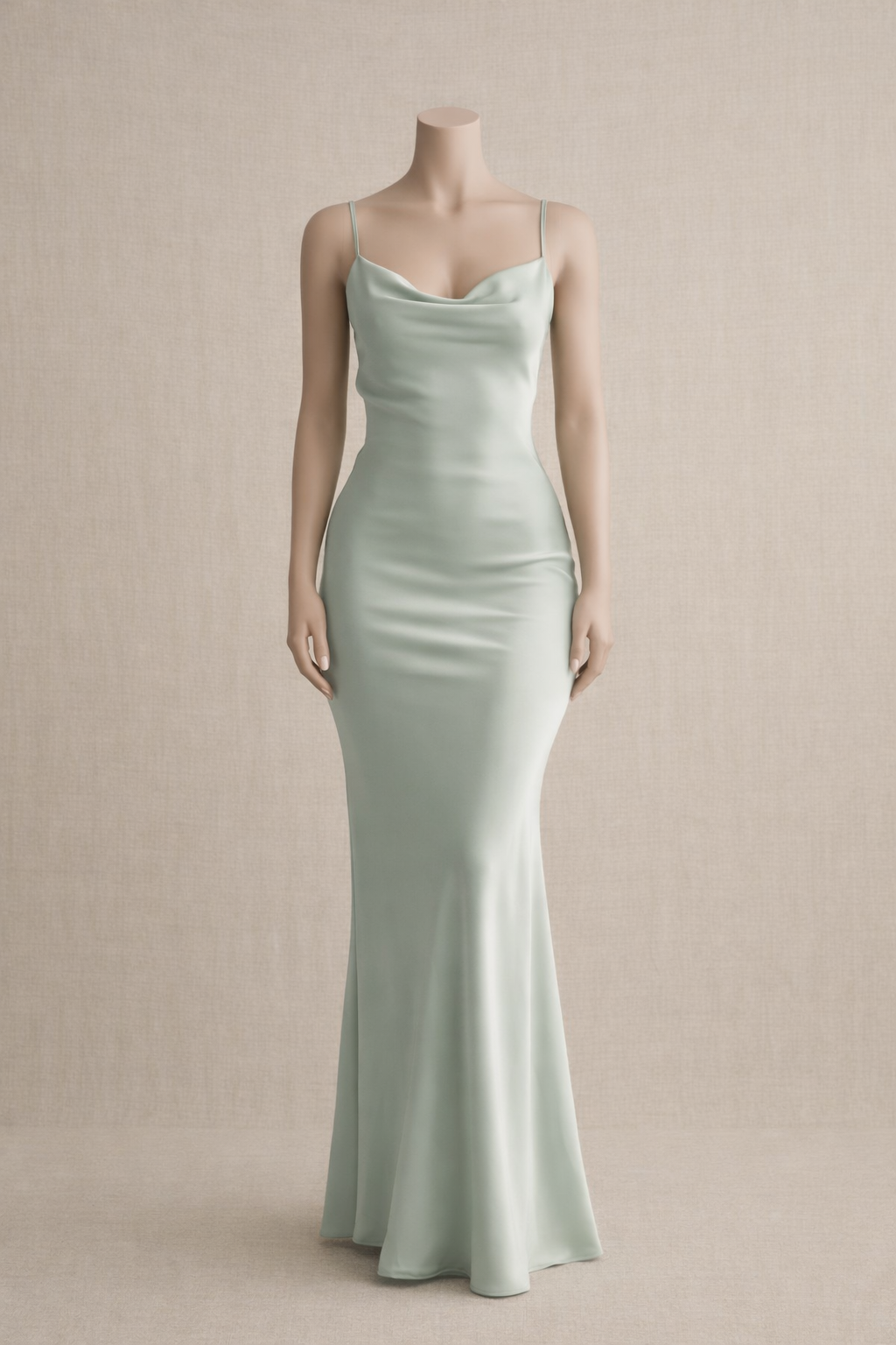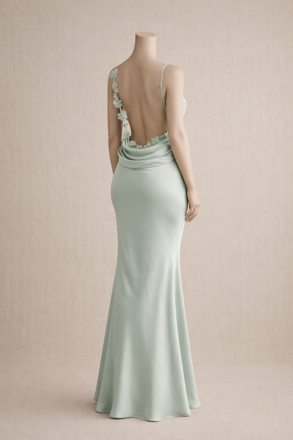 Son décolleté en V et ses fines bretelles subliment le buste, tandis que le dos nu apporte une touche sensuelle maîtrisée. La coupe slim et la longueur cheville allongent naturellement la silhouette.