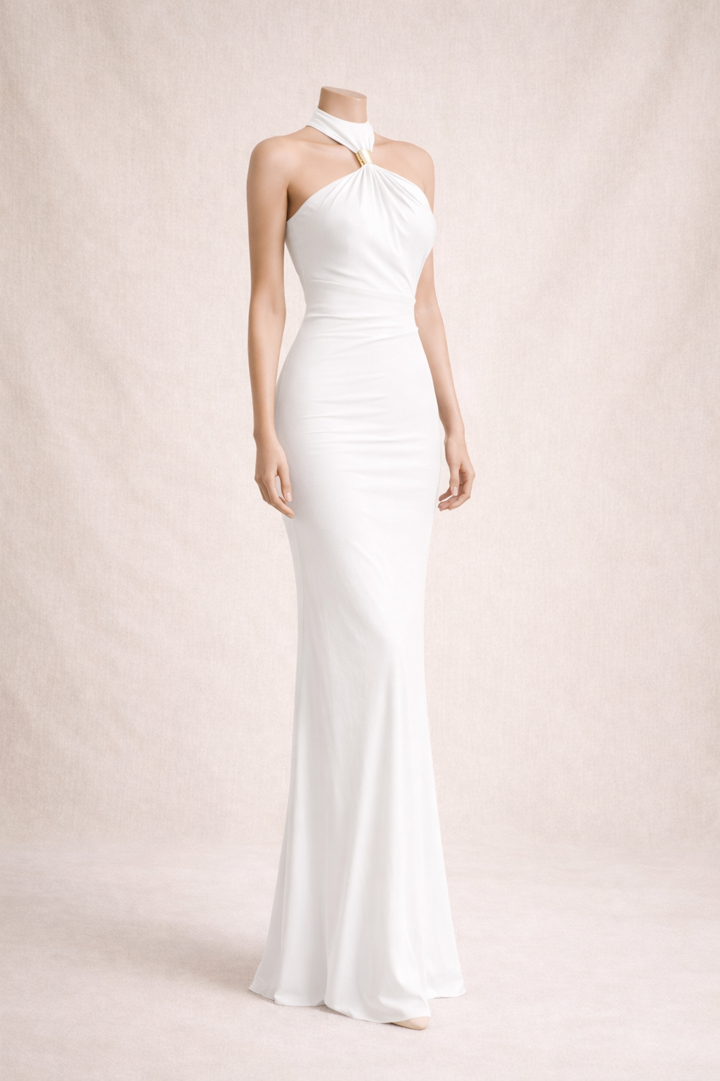 Robe longue femme à coupe droite et ajustée, conçue pour épouser la silhouette avec précision et élégance.