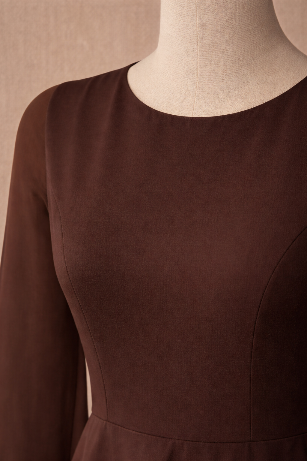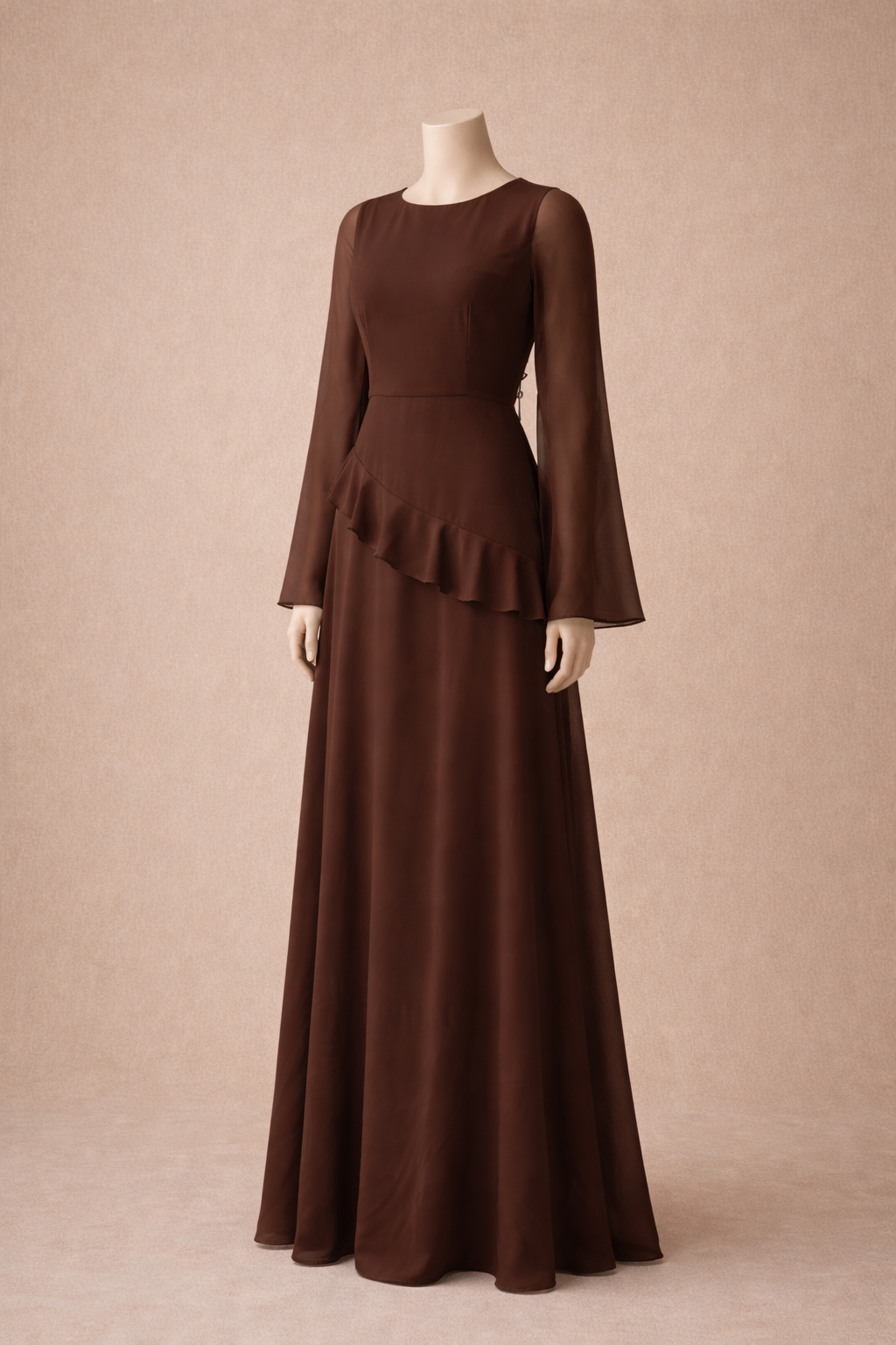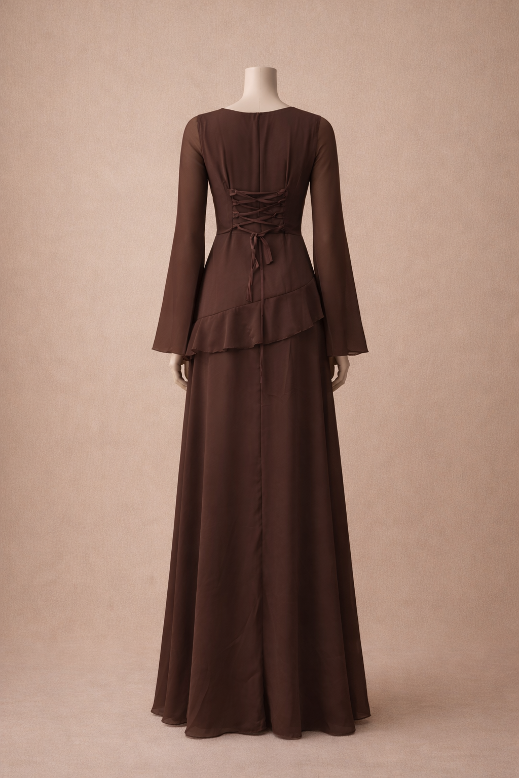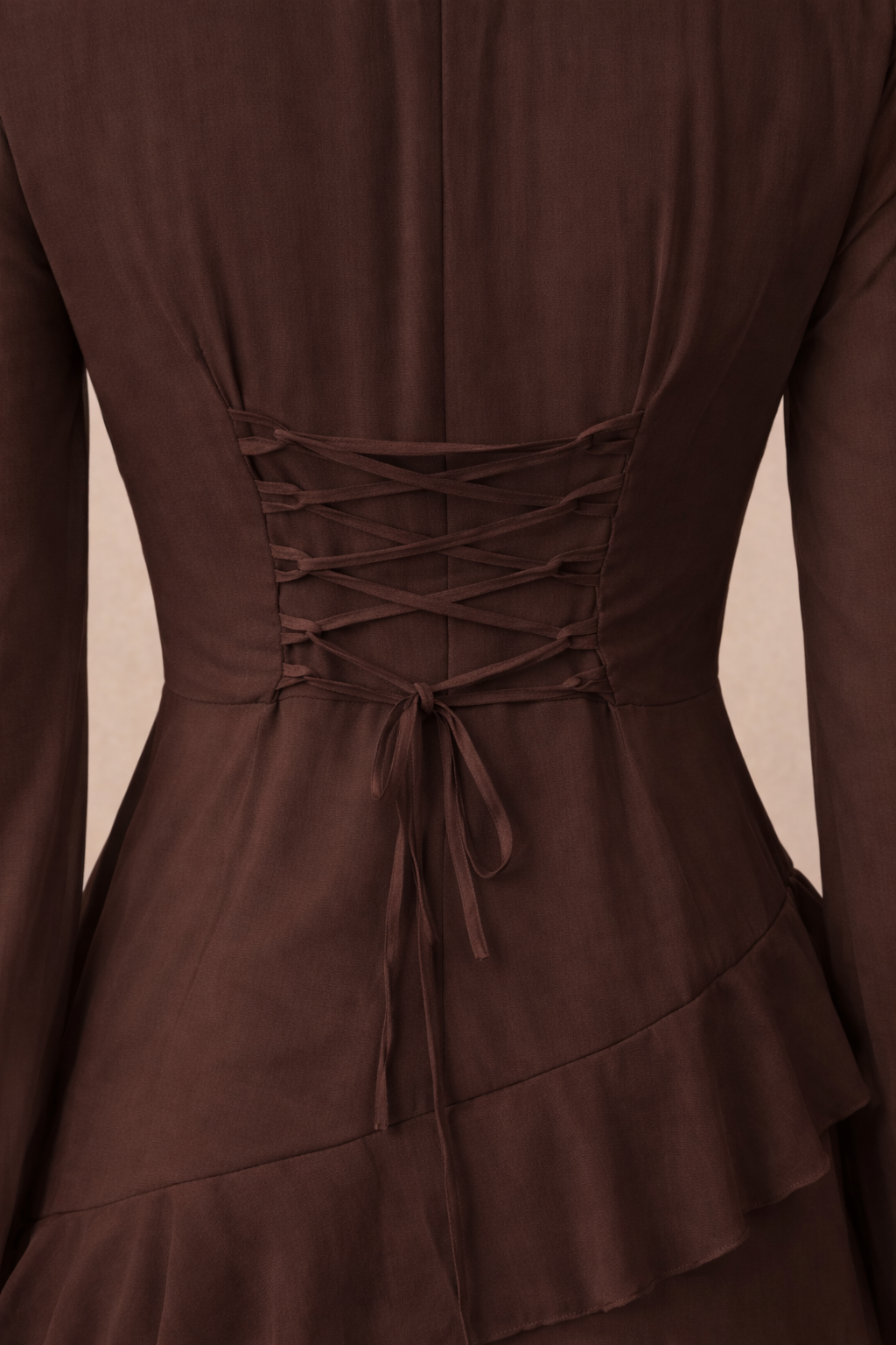 Son encolure ronde (O-neck) équilibre la silhouette tandis que la taille empire affine naturellement la posture. Les manches longues évasées et les détails volantés apportent mouvement et élégance.
