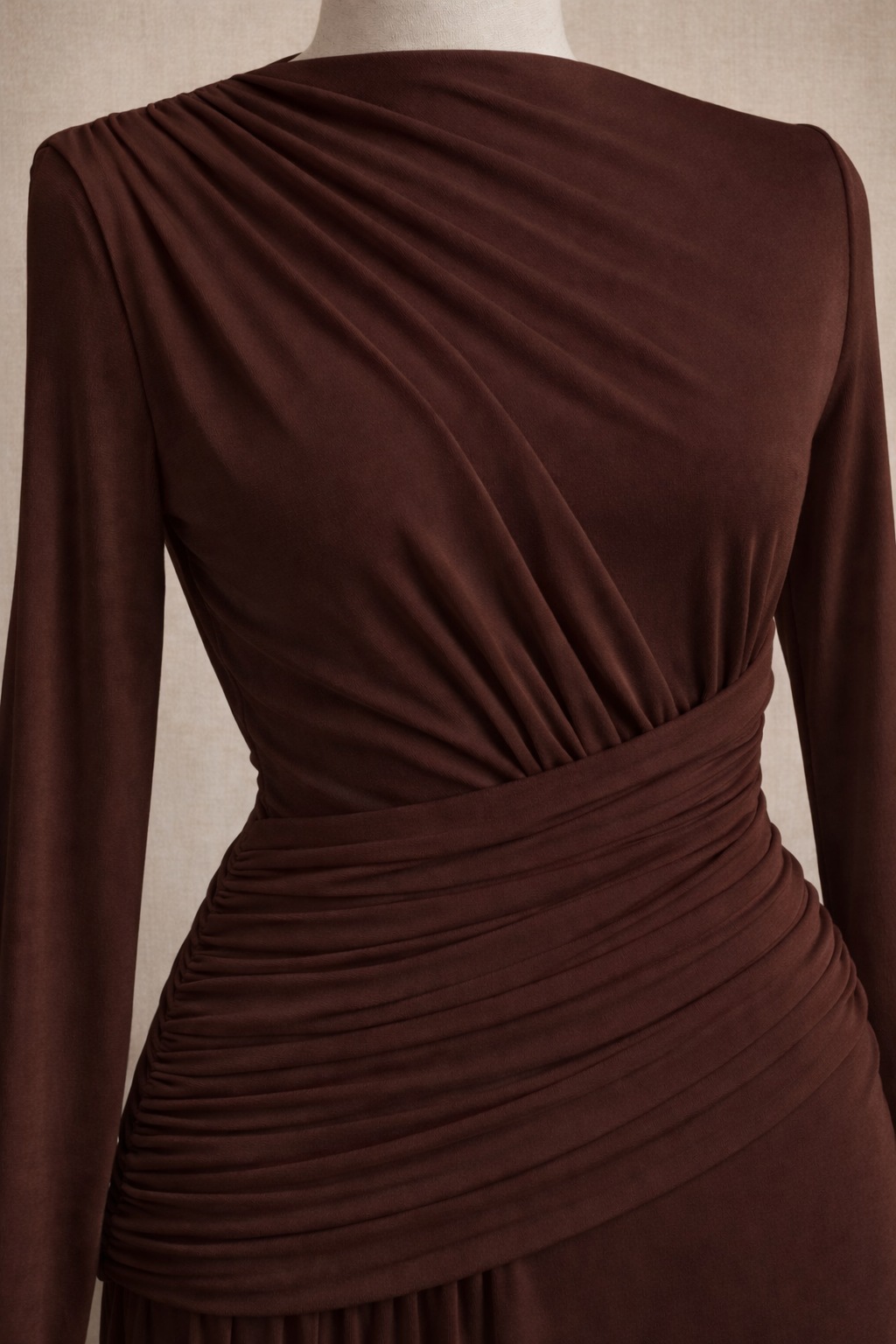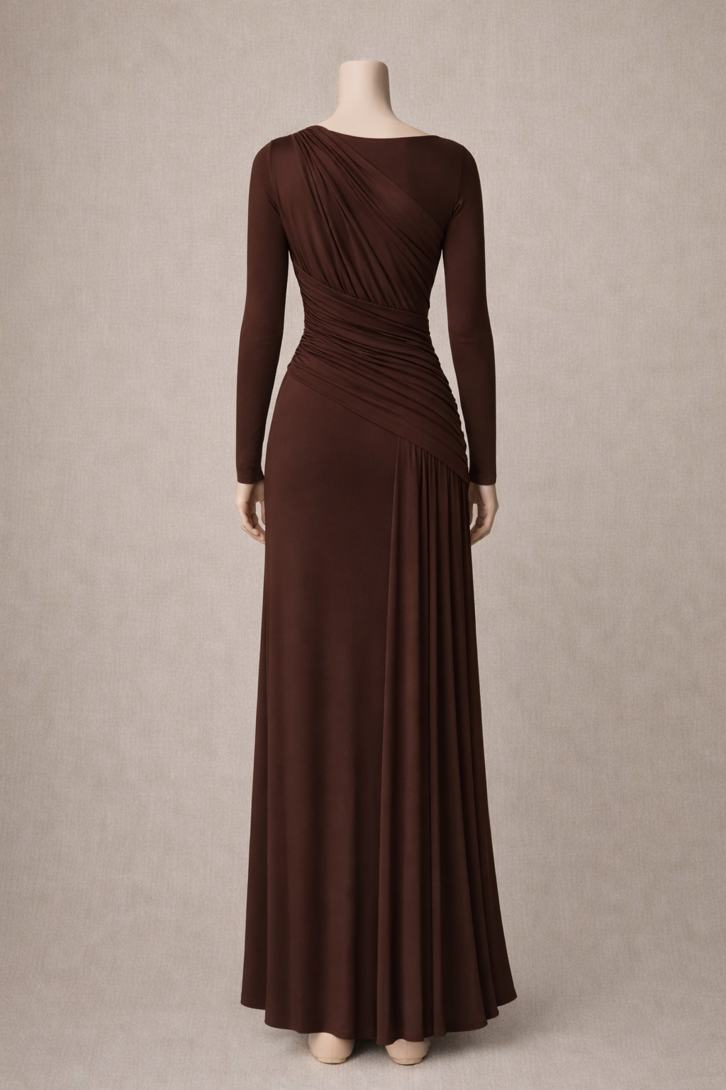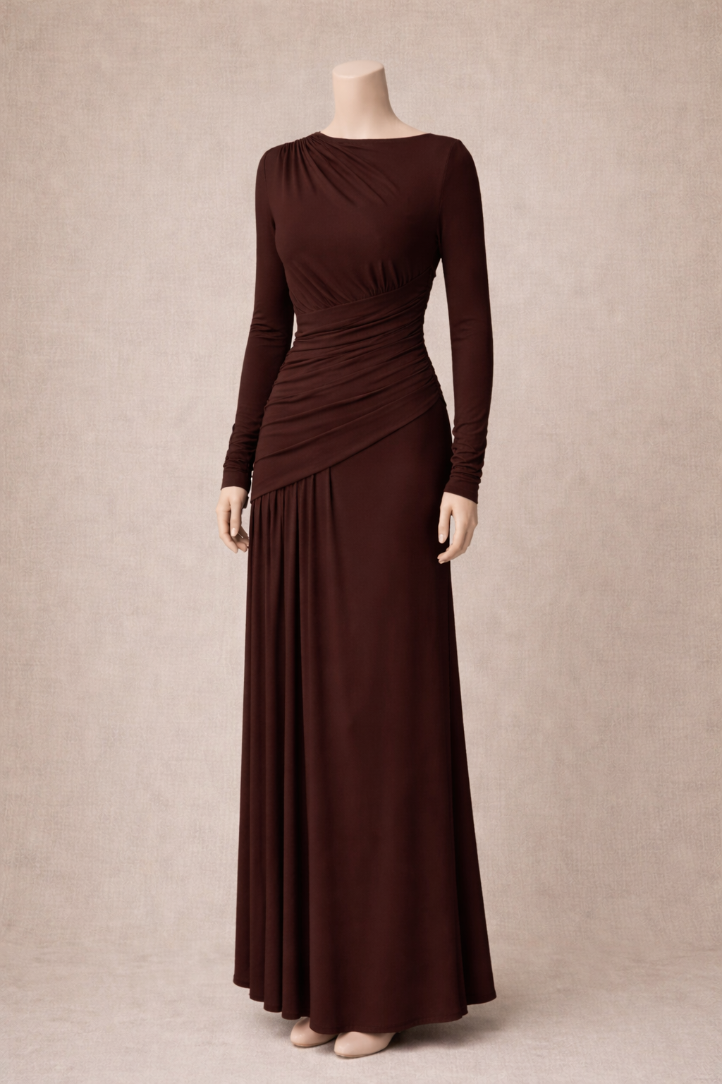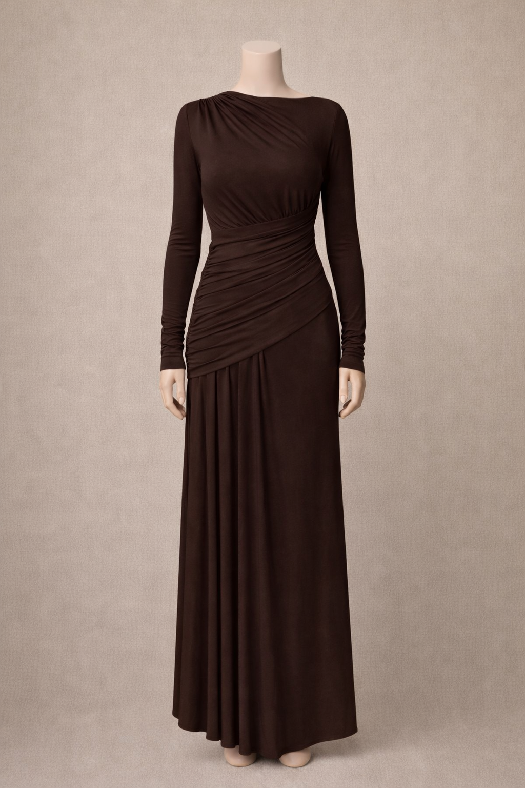 Robe longue marron drapée à manches longues