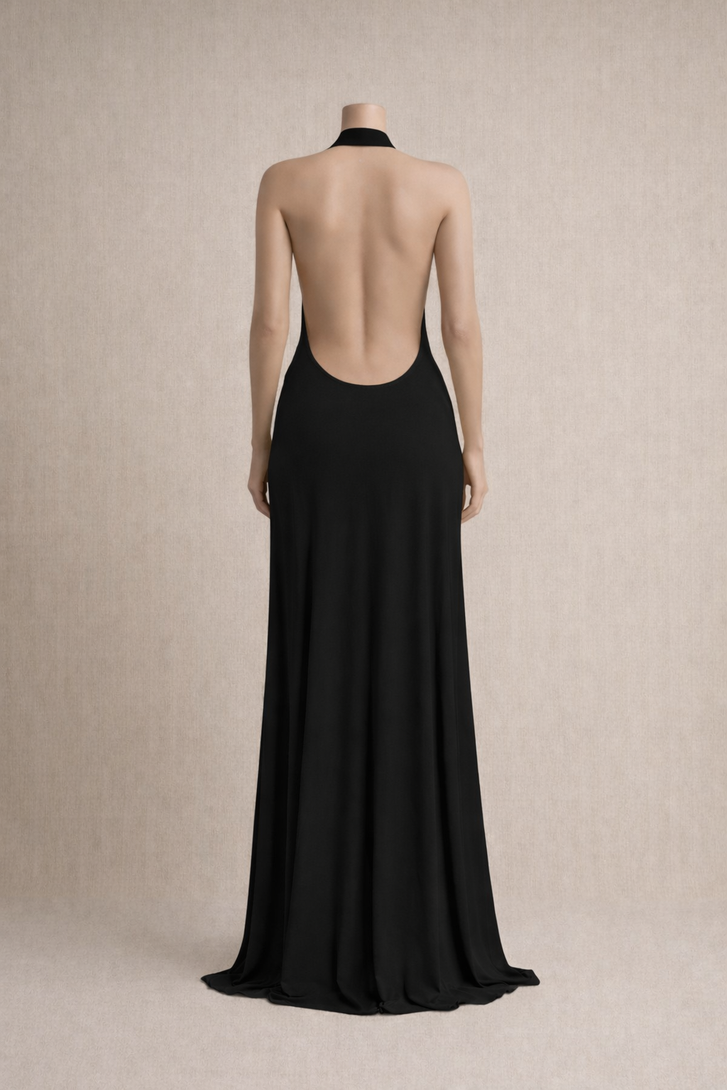 Robe longue noire drapée à col licou et dos nu