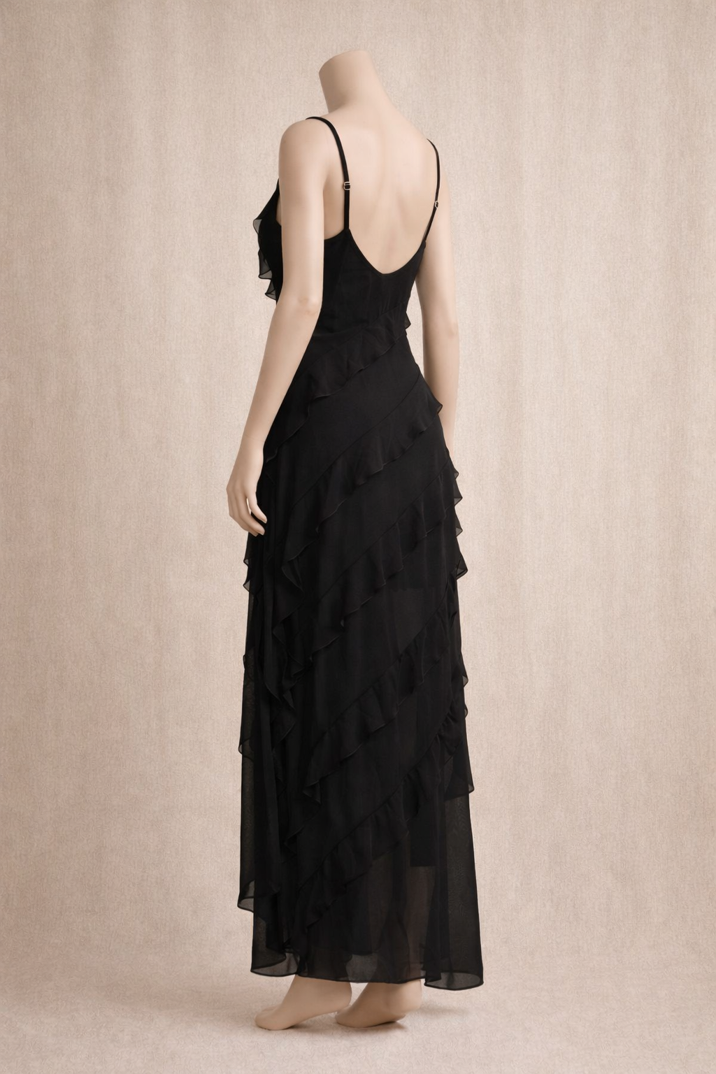 Son décolleté en V et ses fines bretelles apportent délicatesse, tandis que la coupe slim équilibre la ligne. Le détail asymétrique renforce son caractère moderne.