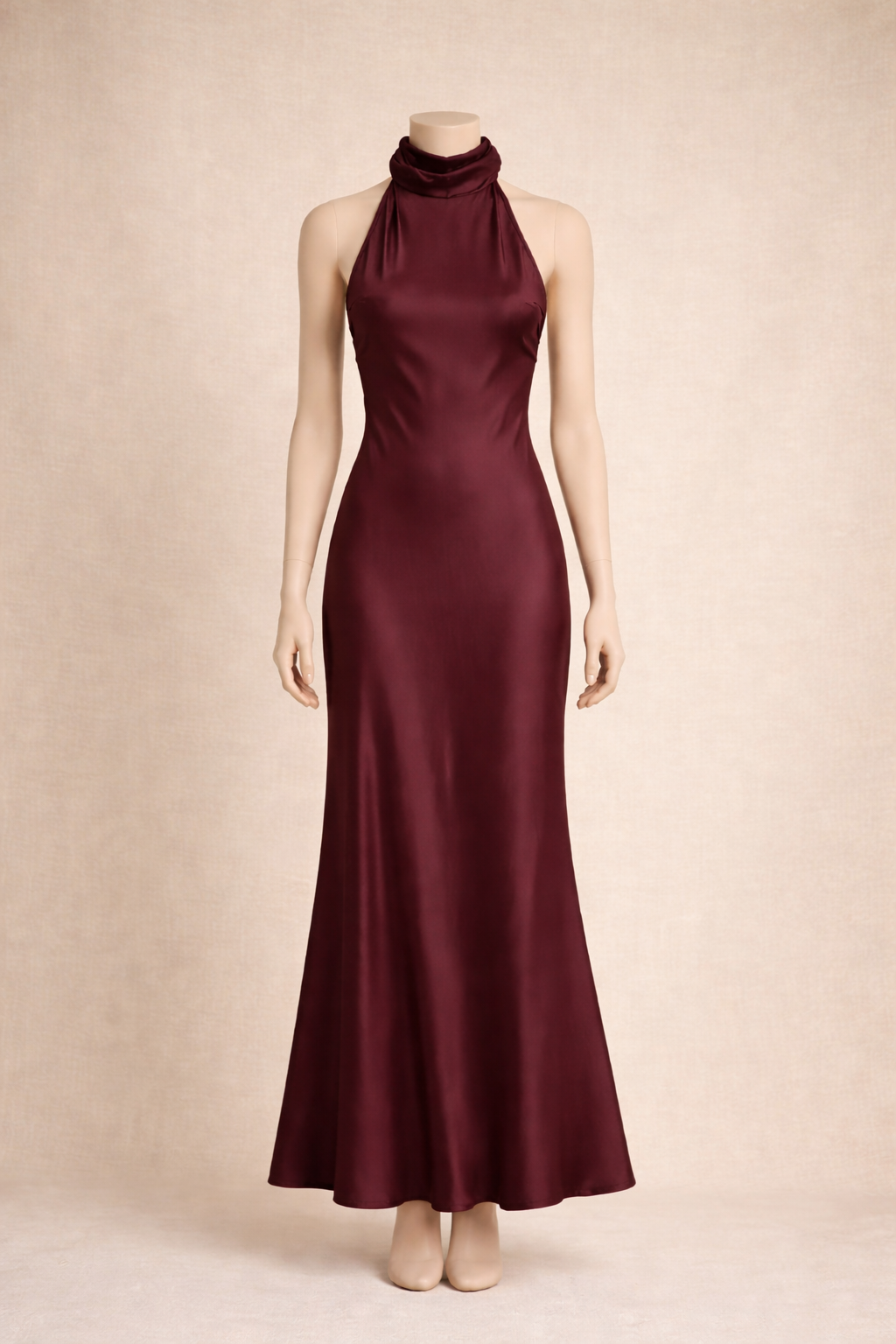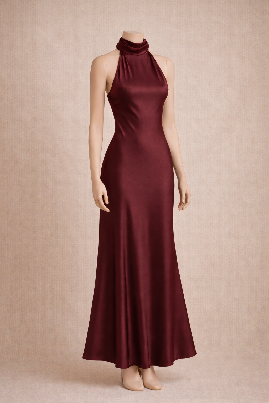 Son col halter sublime les épaules et met en valeur le port de tête, tandis que le design dos nu accentue sa féminité. La coupe fluide et la longueur cheville offrent une ligne élancée et sophistiquée.
